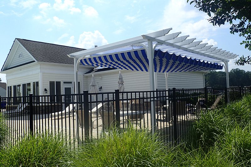 Commercial awnings and canopies are a beautiful way to add shade to your venue’s pool, entryway, outdoor seating area, rooftop deck, or anywhere clients would benefit from shade. They attract attention by helping your business stand out from others, and increase customer capacity by utilizing outdoor space more effectively. Both awnings and canopies attach to an exterior wall, or canopies can be freestanding and supported with legs. Canopies can also be installed with or without decorative pergola rafters, or the fabric can be installed underneath an existing pergola.